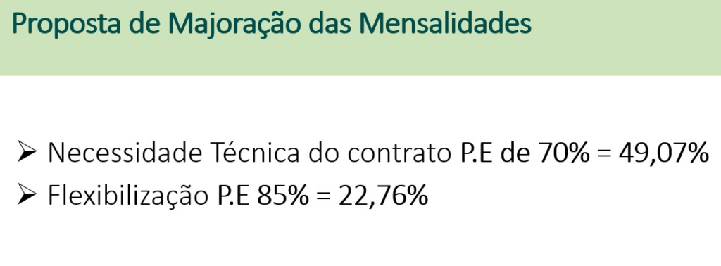 Considerando que este é o primeiro reajuste após a migração para a Unimed Curitiba, a operadora apresentou uma proposta de flexibilização do ponto de equilíbrio para 85%, o que resultou em um índice inicial de reajuste de 22,76%.